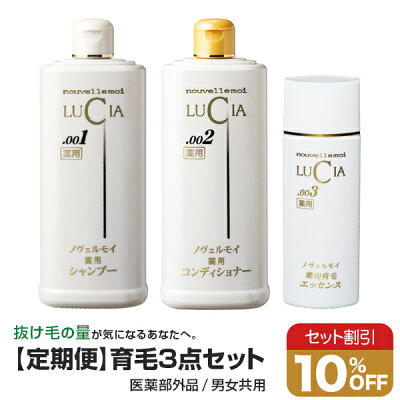 育毛シャンプー/スカルプシャンプー/育毛剤/頭皮ケア メーカー希望小売価格はメーカーカタログに基づいて掲載しています(PDF) 商品名【定期便】育毛3点セット(育毛剤:85ml) セット内容薬用ヘアシャンプー345ml×1本 [約3〜4ヶ月分]、薬用ヘアコンディショナー345ml×1本 [約3〜4ヶ月分]、薬用育毛エッセンス85ml×1本 [約40日分] 用途男女共用 生産日本 メーカー(製造)株式会社ルチア0120-171717 広告文責メーカーに同じ 成分こちらからご確認ください>> 区分医薬部外品 ギフト対応